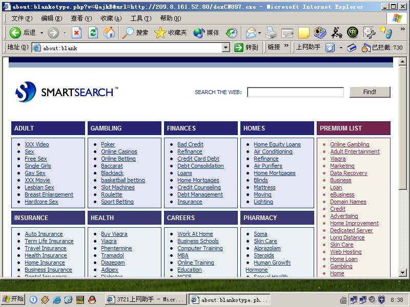 改册表没有用的。楼上重的哪种,他在在你的SYSTEM里建了一个*.INI(中的网页不一样,*。INI也不一样)文件,哪个文件直接删,删不掉的,先用进程管理去结束哪个INI文件,再去删,注意一点的是,你一但删除*。ini文件,最好去查一个注册表,在没有重启机子之前不要再用IE. |